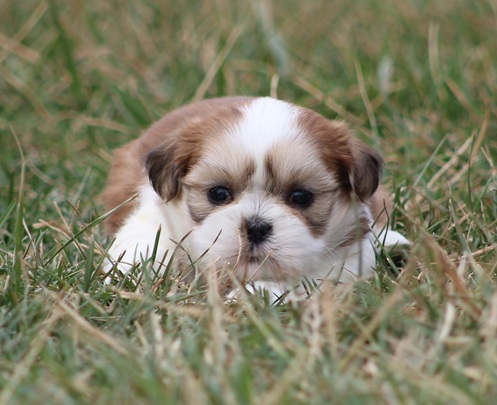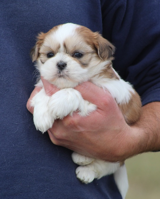 About her parents: Benji (father) is gold & white and weighs 14 pounds. Sugar (mother) is brindle & white and weighs 18 pounds.
