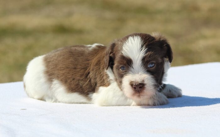 About his parents: Bentley (father) is chocolate and white and weighs 14 pounds. Shawna (mother) is tan and weighs 13 pounds.